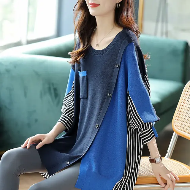 This stylish and versatile t-shirt is perfect for any wardrobe. The Fashion Striped Spliced Knitted All-match Female Tops Commute Pockets Long Sleeve Round Neck Loose T-shirt Women’s Clothing is an essential item for any modern woman. Crafted with a stylish striped spliced knitted pattern, this top features a long sleeve, round neck, and loose fit. It also includes two pockets, perfect for carrying your small items while on the go. This is the perfect all-match piece, perfect for any occasion. So don’t wait, get yours now and add some stylish flair to your wardrobe!