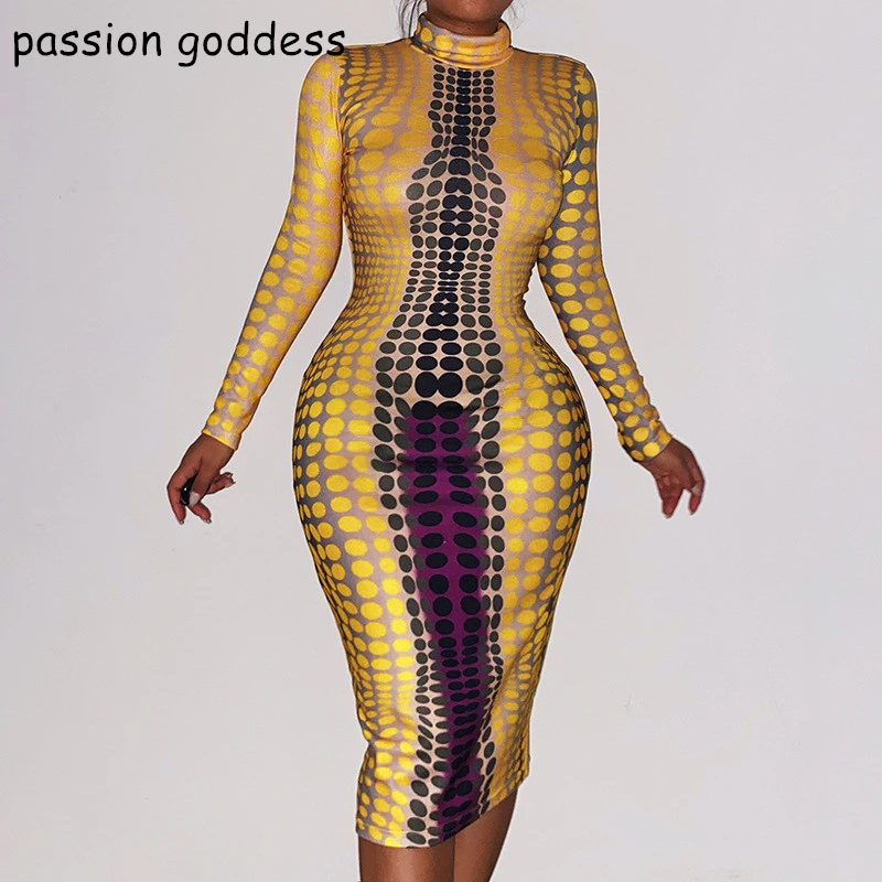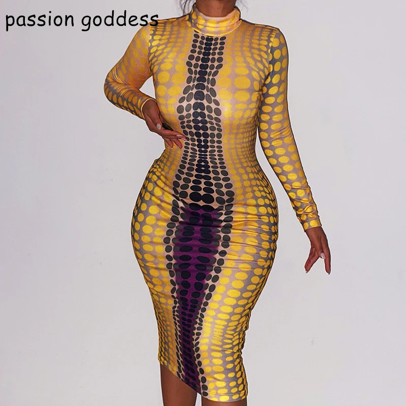Women’s Casual Mid Calf Bodycon Pencil Dress! This beautiful dress is perfect for any event, from a casual day out to a night on the town. The dress features a turtleneck, long sleeves, and a polka dot print in a bright yellow autumn hue. The bodycon fit will hug your curves in all the right places, while the mid-calf length gives you the perfect opportunity to show off your shoes. The Vestido De Mujer is the perfect dress for any occasion!
