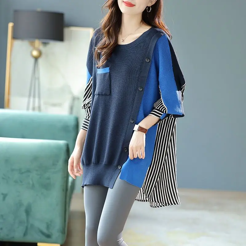 This stylish and versatile t-shirt is perfect for any wardrobe. The Fashion Striped Spliced Knitted All-match Female Tops Commute Pockets Long Sleeve Round Neck Loose T-shirt Women’s Clothing is an essential item for any modern woman. Crafted with a stylish striped spliced knitted pattern, this top features a long sleeve, round neck, and loose fit. It also includes two pockets, perfect for carrying your small items while on the go. This is the perfect all-match piece, perfect for any occasion. So don’t wait, get yours now and add some stylish flair to your wardrobe!